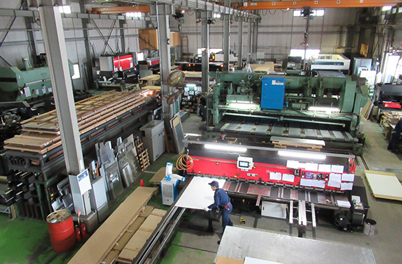 8000㎜まで加工可能なレベラーライン、同じく8000㎜まで可能なシャーリング、ブレーキプレス、6kwレーザーやタレパン複合機。その他HL、#400、No.4 研磨、ビニール貼りも自社加工で対応。